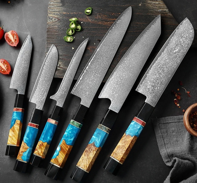 - Blade Material: High-carbon stainless steel (VG10, AUS10) and Damascus steel offer superior edge retention and corrosion resistance.